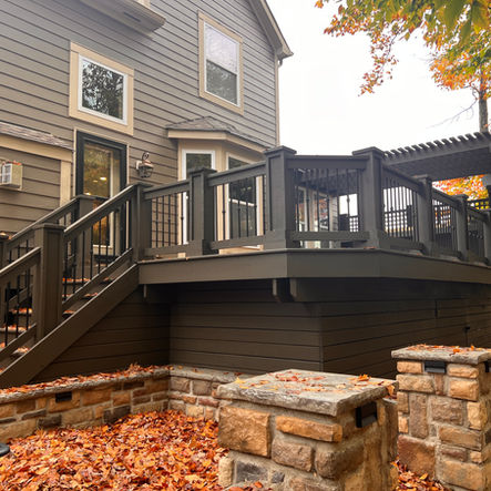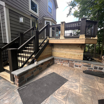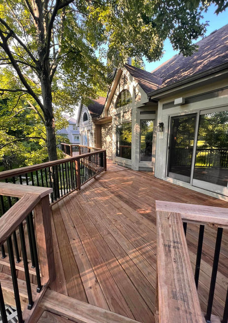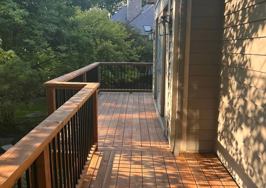 A cedar tone remodeling project completed with black aluminum square spindles and a drink rail. Cedar Tone is a pressure treated and prestained wood that makes a budget friendly option.
